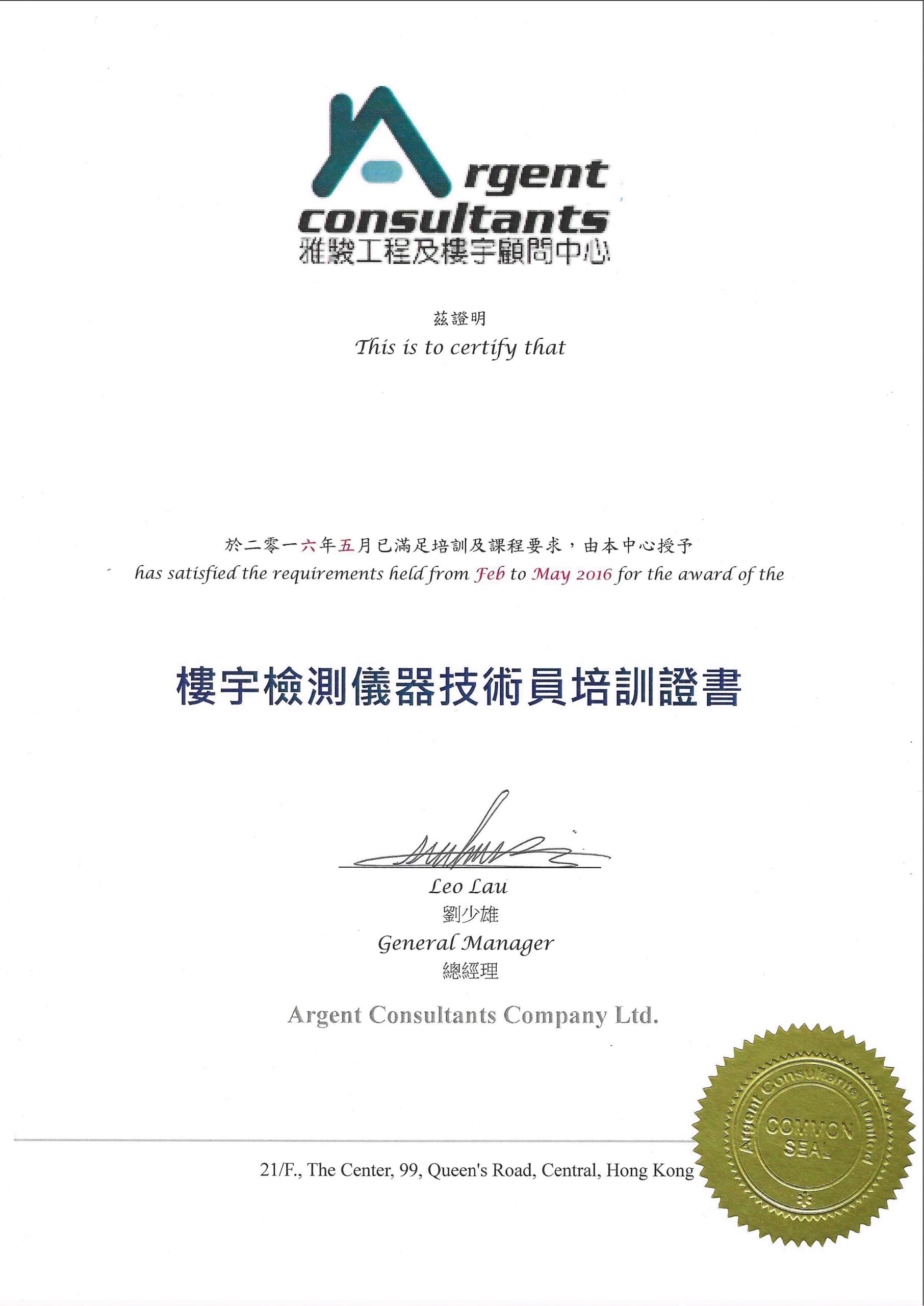 樓宇檢測儀器技術員培訓證書 Training Certificate for Technician on Building Inspection Devices